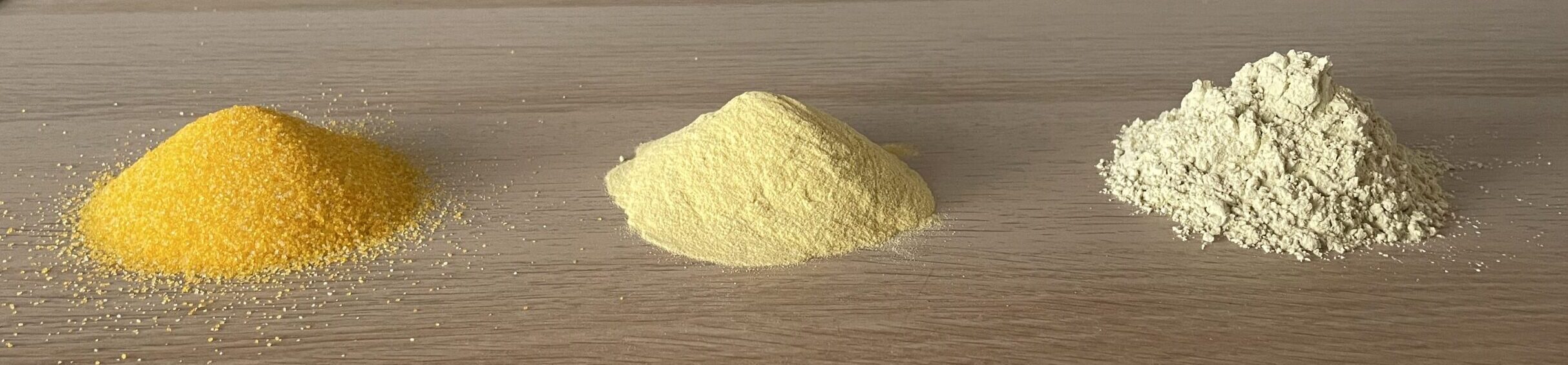 Vstupní materiál (vlevo), mikronizovaný materiál díl A (střed) a díl B (vpravo)